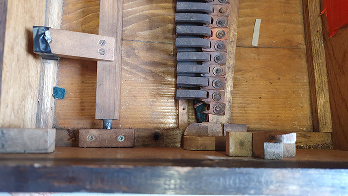 Restaurierung: Grundlegende Restaurierung durch Jan Großbach (Frankfurt-Höchst) im Mai und Juni 2023; dabei Identifikation von Machell als Hersteller und Dyson & Sons als Händler/Vermieter. Beseitigung der nicht-originalen Teile und Ersatz durch dem Original entsprechende Teile. Nachbau der verloren gegangenen Stimmgabel im Diskant.